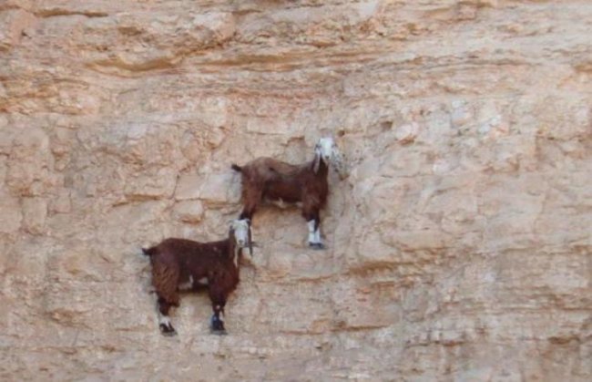 Как объяснила женщина, вопреки распространённому мнению безумные козы не восстают против гравитации. Удержаться на едва выступающих из стены камнях им помогают мягкие и подвижные копыта, а чувствительные и большие уши позволяют улавливать малейшие колебания воздуха и удерживать баланс.