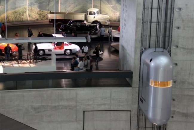 В музее легендарного автомобильного концерна Мерседес-Бенц в Штутгарте без темы автопрома не обошлось даже оформление лифтов. Подъемники стилизовали под футуристические капсулы, напоминающие линейку концепт-каров. Они бесшумно поднимают посетителей на 9-й этаж, с которого начинается экспозиция.
