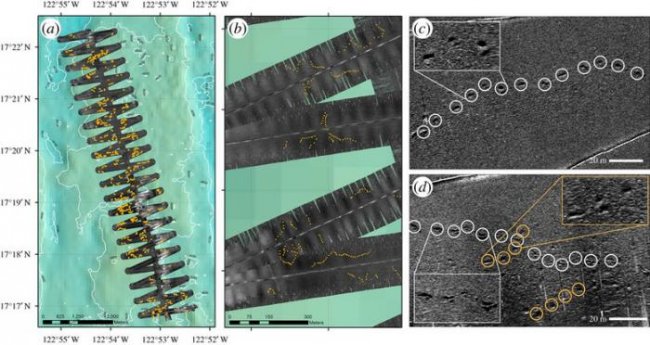 Подводный робот «Sonar» проплыл на глубине по ровному дну зоны около 3,5 км и делал снимки на протяжении всего пути. Впоследствии снимки соединили и обнаружили на них последовательную цепочку из 3.500 (!) необычных ямок.