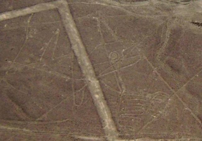 Геоглифы Наска, в том числе изображение колибри (вверху слева) и обезьяны (внизу слева).