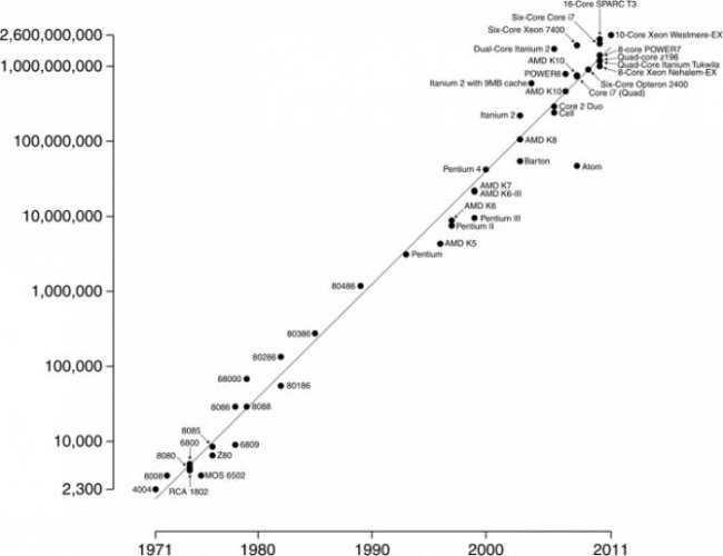 Вертикальная ось имеет логарифмическую шкалу, а прямая соответствует экспоненциальному закону. Удивительно то, что количество транзисторов и по сей день увеличивается примерно вдвое раз в два года.