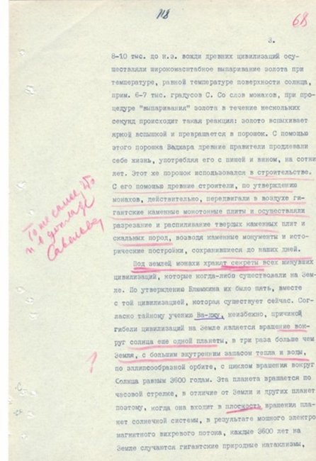Дверей, как и сопровождавших его монахов, Блюмкин, если верить записке, насчитал тринадцать. Из секретных залов с механизмами богов ему показали всего два. В одном из них находилась некая машина, которую монахи называли «ваджра». Внешне она представляла собой огромные щипцы, которые, по словам монахов, появились в подземных тоннелях за 8-10 тыс. лет до н. э. С помощью этой машины происходило выпаривание золота при температуре, близкой к солнечной, — 6-7 тыс. градусов. Визуально, по словам монахов, процесс выглядел следующим образом: золото вспыхивало и превращалось в порошок. Этот порошок элита древних цивилизаций добавляла в еду и питье, продлевая тем самым свою жизнь на сотни лет. С помощью этого же порошка древние жители передвигали огромные каменные блоки, правда, технологии, как это происходило, не сохранилось.