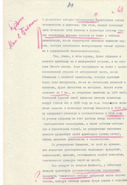 Поэтому автор статьи, как и большинство жителей планеты, окунулся в свои дела, опрометчиво забыв о страшном предсказании. И вдруг летом этого года на одном из аналитических сайтов я увидел сканированные фотографии некой служебной записки первых лет советской власти, составленной где-то в недрах ОГПУ. Правда, номер и шапка документа были заретушированы, поэтому определить, секретный документ или нет, кем и когда он составлен, было невозможно. В то же время непосредственно сам текст записки был виден достаточно отчетливо и вызывал определенный интерес, ведь в нем говорилось о том, что монахи Тибета якобы рассказали экспедиции, состоящей из сотрудников ОГПУ, о конце света, который действительно произойдет, но в 2014 году.