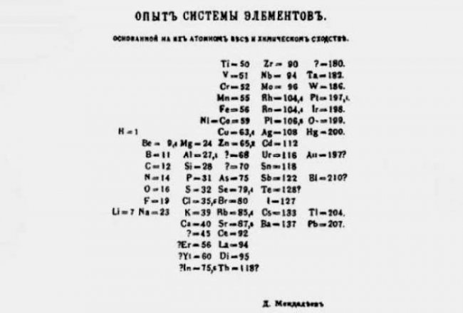 Профессор Дмитрий Менделеев вписал свое имя в историю химической науки в первую очередь своей периодической таблицей химических элементов, первый вариант которой был составлен в 1869 году. Во время ее составления, ученый не единожды перемещал карточки с элементами в разных комбинациях, пытаясь составить из них ряды подобных по свойствам элементов.