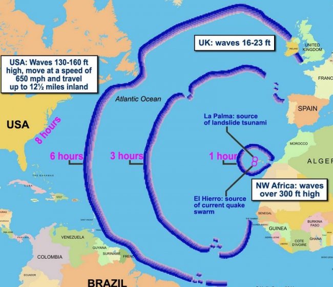 Заметим, что Кумбре-Вьеха последний раз извергался в 1979 году, отчего последствия его хорошо изучены. Извержение сопровождается землетрясением и цунами, устремляющимся через Атлантику к берегам Америки, а его основной удар приходится на США – это волны не менее 20-25 метров высотой. Однако если, согласно пророчеству, вулкан рухнет в океан, то до Северной Америки может докатиться волна уже в 650-1500 метров высотой. И это будет настоящий Апокалипсис для Соединенных Штатов.