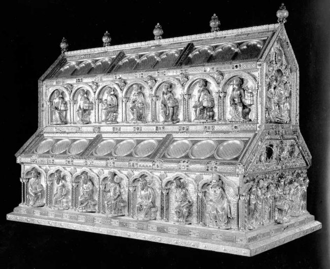 НЕМЕДЛЕННО ПОСЛЕ ЭТОГО началось создание Саркофага Трех Магов (Magi)… В честь вновь обретенных мощей, Рейнальд приказал обновить Собор, добавив две «деревянные» башни с восточной стороны>.