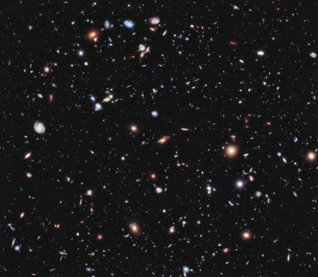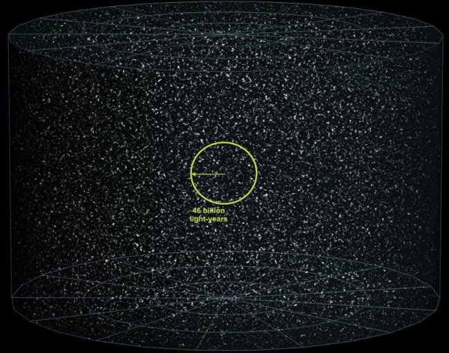 Вселенная, какой ее видят самые мощные телескопы (даже в теории), огромна, велика и массивна. Вместе с фотонами и нейтрино, она содержит около 10^90 частиц, скомканных и сгруппированных вместе с сотнях миллиардов или триллионов галактик. В каждой из этих галактик триллион звезд (в среднем), и они разбросаны в космосе в сфере около 92 миллиардов световых лет в диаметре, с нашей точки зрения.