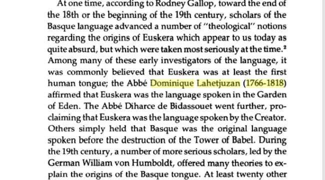 «Приблизительно в тот же самый период, баскский священник Эрроа (Erroa), вслед за аббатом Лахетжюзаном, заявил, что баскский язык является языком общения в Эдеме (в шумерском языке – «эден» значит долина, жители которой часто праздновали или веселились и пировали, а на иврите «эдем» означает радость, удовольствие) . Его коллеги думали, что он был сумасшедшим, но Эрроа был так глубоко убежден в своей правоте, что обратил на себя внимание церковников Памплоны, которые направили свое обращение к Главе Собора Памплоны.