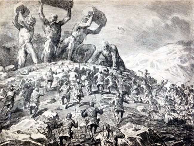 Великаны привольно жили в своем каменном дворце. Целыми днями они ели и пили, нагуливая жир, и стали такими тяжелыми и огромными, что даже каменная равнина начала оседать под их телами. Так же жирели и тяжелели их огромные кони.