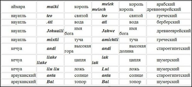 Трудно согласиться с тем, что какое-то сибирское племя 40 тысяч лет назад употребляло слово meo (leo), «святой», и оно было занесено к ацтекам, а потом — к грекам и при этом не изменилось за 1600 поколений… А слово бал (bal) «топор», в Шумере и у отстоящих от них на три четверти пути вокруг Земли арауканцев? Ох, и маловероятно.