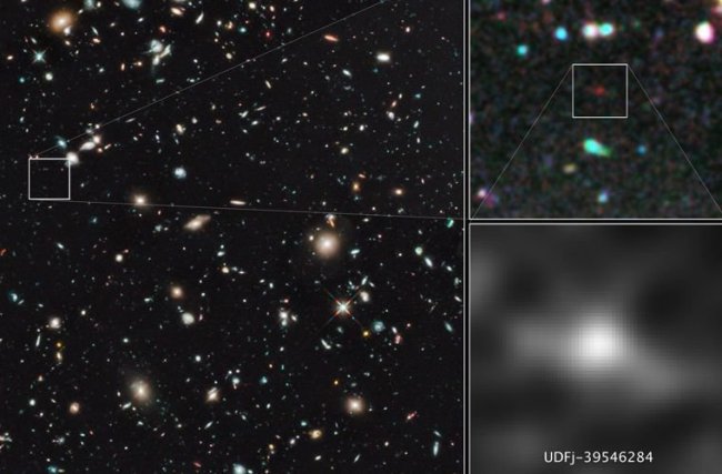UDFj-39546284 состоит из голубых звезд, сама она небольшая (2000 световых лет в диаметре) и находится в созвездии Печь.