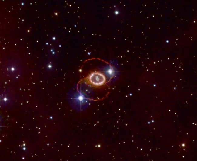 Остатки сверхновой 1987a, расположенной в Большом Магеллановом облаке в 165 000 световых годах от нас. Свыше трехсот столетий она была самой ближайшей наблюдаемой сверхновой к Земле
