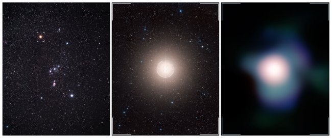 Бетельгейзе на фоне созвездия Орион (слева). Одиночное изображение (в центре). Правый снимок представляет собой предыдущее лучшее изображение звезды, полученное с помощью Очень большого телескопа