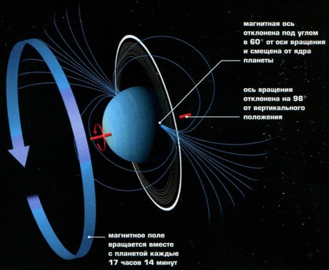Если магнитосфера Земли организована вполне аккуратно со стороны Северного и Южного магнитных полюсов, то из-за кособокого «пьяного» вращения Урана его магнитосфера организована гораздо хаотичнее. Магнитное поле планеты весьма специфическое и наклонено на 60 градусов относительно оси вращения. Из-за такой особенности магнитосфера Урана время от времени «оголяется», а затем опять «закрывается».