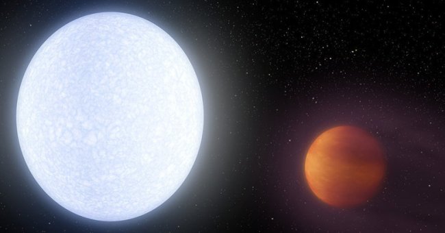 Хотя мы не можем измерить точное расстояние издалека, планета обращается вокруг своей звезды через каждые 1,5 суток (Меркурий свою орбиту завершает за 88 дней). На поверхности этой планеты температура составляет поразительные 4300 градусов, а это горячее, чем поверхность многих звезд с массой меньше солнечной. Твердая планета Меркурий превратилась бы в каплю лавы при такой температуре. Но KELT-9b, однако, является газовым гигантом типа Юпитера.