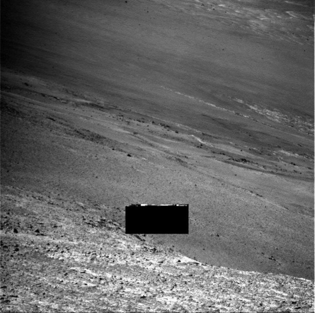 Ровер Opportunity в тот 4739-й день кроме камня сделал еще 10 фото. На одном из них просто ландшафт, но в центре черный прямоугольник. Он — не марсианский, на снимке что-то замазано.