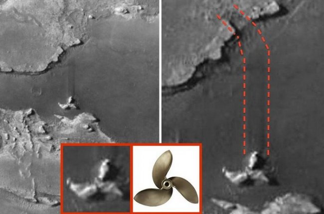 По крайней мере, говорит уфолог, на поверхности плато Меридиана легко просматривается необычная структура, напоминающая пропеллер. Каждому скептику, который посчитает, что это обычный камень, стоит указать, что почва здесь песчаная, а потому на ней хорошо виден след, который оставил этот объект при падении. Создается впечатление, продолжает Скотт, что НЛО врезался в скалу, отчего развернулся где-то на сорок-пятьдесят градусов и потом протаранил поверхность Марса, пока не остановился.