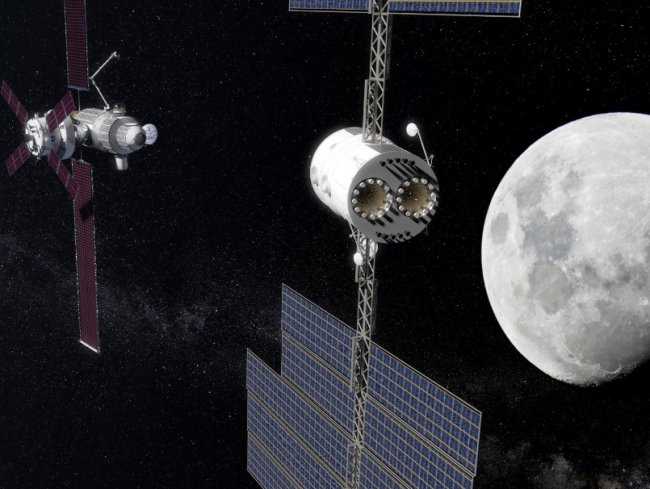 Художественное представление лунной орбитальной станции NASA Deep Space Gateway (слева)