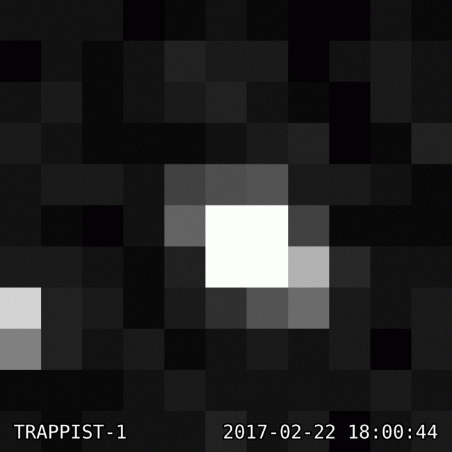 А если и вы не потеряли интерес, то предлагаем взглянуть на изображение, опубликованное аэрокосмическим агентством NASA, на котором заметно изменение в яркости звезды TRAPPIST-1 в промежуток в один час. Изображение было получено 22 февраля. Изменение яркости говорит о том, что в этот момент напротив звезды проходит одна из ее планет.