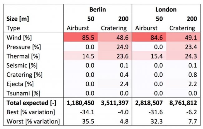 Во втором сценарии Рамф рассмотрел вариант, при котором падение астероида произойдет в Лондоне и Берлине. В двух случаях виновниками торжества являются два разных по размеру астероида – 50 и 200 метров соответственно, — а также рассматриваются два уровня воздействия: только при наличии воздушного взрыва ударной волны либо воздушного взрыва вместе с падением объекта. Результаты можно глянуть на графике ниже. Жирными черными цифрами выделено предполагаемое количество жертв.