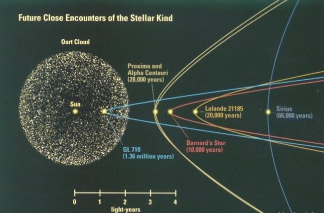 Все, что нам на данный момент было известно о блуждающей звезде Глизе 710, так это то, что траектория ее движения лежит в непосредственной близости к нашей Солнечной системе. Однако новое исследование, проведенное польскими астрономами, показывает, что звезда пройдет на расстоянии 77 световых дней от нас. А этого будет вполне достаточно, чтобы ее мощная гравитация смогла сбить орбиту астероидов и комет, находящихся в облаке Оорта, и направить их прямиком в направлении нашей Земли.