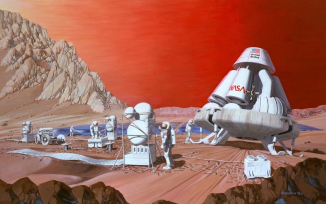 Первое детальное видение американского космического полета на Марс было детищем Вернера фон Брауна — бывшего нацистского ученого, который работал в НАСА после Второй мировой войны. Его книга 1952 года «Проект Марс» стала первым широко распространенным планом строительства колонии на Марсе. Фон Браун представлял себе, что флот из 10 массивных космических кораблей, собранных прямо в космосе и расположенных на орбите Марса, будет нести 70 человек, наряду с продовольствием и всем необходимым для выживания.