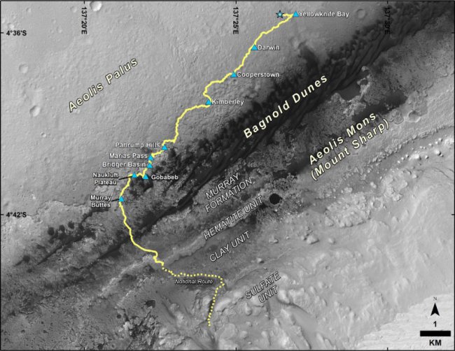 Маршрут ровера «Кьюриосити» с точки его посадки на Марс четыре года назад и до его нынешнего расположения в области Murray Buttes. Кроме того, здесь отмечены запланированные места назначений Hematite Unit и Clay Unit, находящиеся в нижней части горы Шарпа