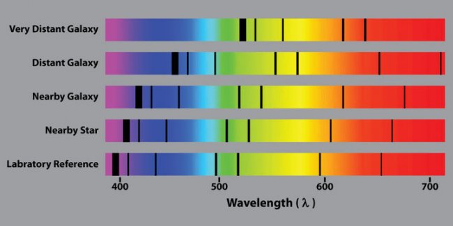 Свет работает примерно так же. Посмотрите на спектрограмму выше, видите черные линии? Они указывают на границы поглощения цвета химическими элементами, находящимися внутри и вокруг источника света. Чем больше сдвинуты линии к красной части спектра — тем дальше объект находится от нас. На основе подобных спектрограмм ученые также определяют то, насколько быстро объект двигается от нас.