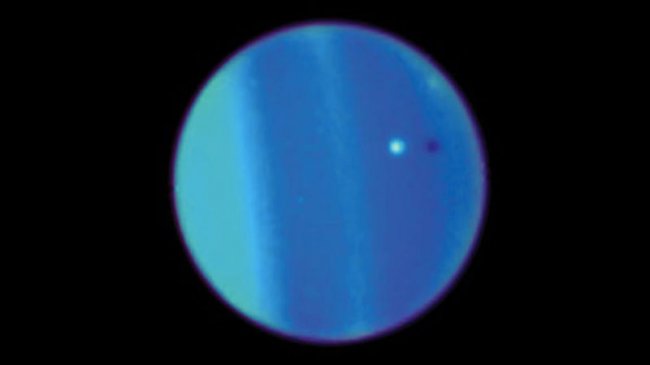 Но самой необычной особенностью планеты была ее ориентация: вместо того чтобы вращаться как другие планеты в системе, Уран лежит и вращается на боку. Причина этого неизвестна; в качестве теории выдвигают планетарное столкновение. В 2009 году члены Парижской обсерватории предположили, что когда планета была в зародышевом состоянии, в планетарном диске сформировалась луна, которая раскачала планету. В 1986 году зонд «Вояджер-2» прошел мимо Урана, изучив атмосферу планеты и открыв ряд дополнительных спутников и кольцевую систему. Он стал первым и единственным зондом, достигшим этой планеты; в настоящее время не планируется никаких дальнейших миссий.