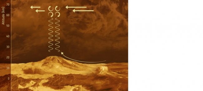 «Когда ветры медленно проталкиваются по горным склонам на поверхности, они создают некие гравитационные волны, — говорит Берто. — Несмотря на название, они не имеют ничего общего с гравитационными волнами, которые являются рябью в пространстве времени — эти гравитационные волны являются атмосферным явлением, которое мы часто наблюдаем в горных регионах поверхности Земли. Грубо говоря, они образуются, когда воздух перекатывается по неровным поверхностям. Волны распространяются вертикально вверх, растут все больше и больше в амплитуде, пока не разбиваются у верхнего слоя облаков, подобно волнам на береговой линии».