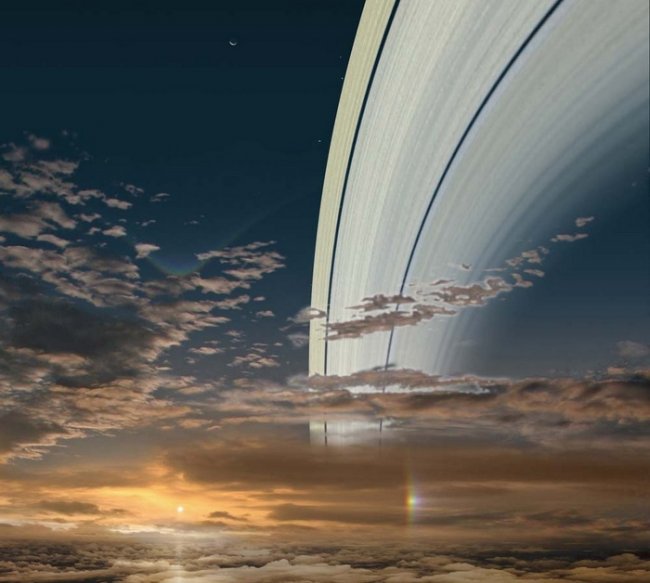 Сатурн с его кольцами – самая удивительная и загадочная планета Солнечной системы, однако она удалена от Солнца еще более – в девять с половиной раз дальше нашей голубой планеты. Но и тут еще властвует утреннее солнце, особенно преломляясь в замерших кристаллах газов и воды, а потому создавая благодаря этому фантастические оптические эффекты, например, ложные светила и ореолы.