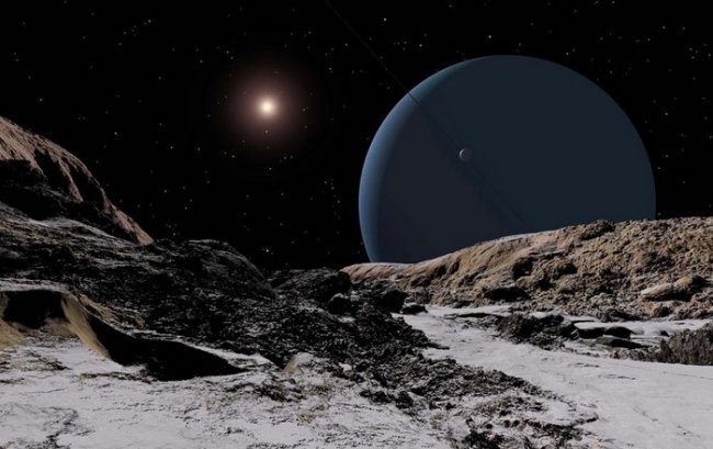 Но это огромное расстояние меркнет в сравнении с отдаленностью Нептуна, который «отброшен» от светила на 4,5 миллиарда километров (в 30 раз дальше, чем Земля). В данном случае мы видим рассвет на спутнике Нептуна – Тритоне. Солнце здесь смотрится как маленькая звездочка, тем более что ее еще и прикрывают своими выбросами пылевые гейзеры.