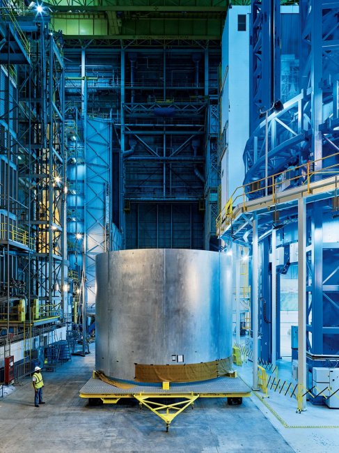 Одна из пяти частей топливного контейнера, который в итоге сложится в 40-метровую конструкцию. Чтобы вывести Orion на орбиту потребуется около 7300 галлонов (2,5 миллиона литров) горючего, представляющего собой смесь охлаждённого водорода с кислородом. Топливные баки собирают на фабрике в Новом Орлеане.
