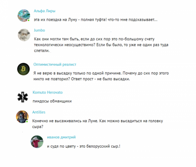 Тем, кто ещё верит в прыжки американцев по Луне, предлагаем несколько комментариев наших глубокоуважаемых экспертов. Если вам нужны какие-то ещё доказательство, то имейте ввиду, что более половины россиян не верят в то, американцы высаживались на Луне.