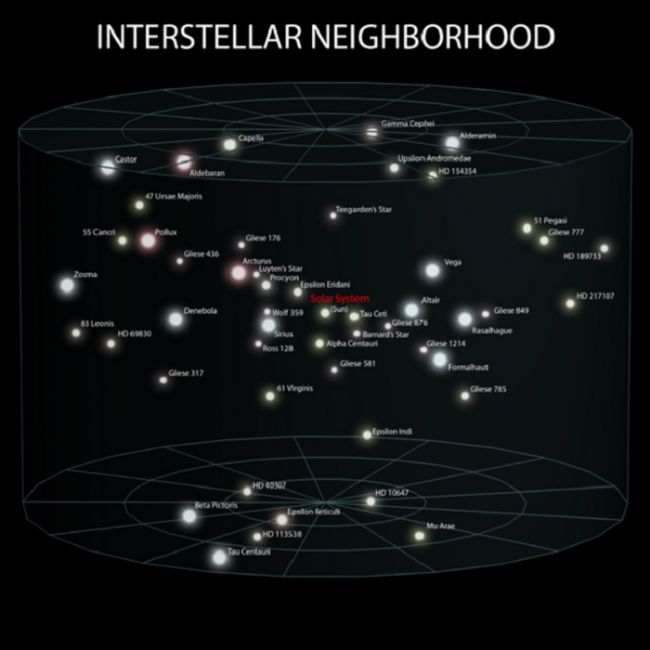 Поскольку в Млечном Пути есть около одного триллиона звезд, он является довольно большой галактикой. На данном изображении показаны некоторые из соседних звезд в районе Солнечной системы.