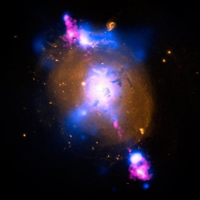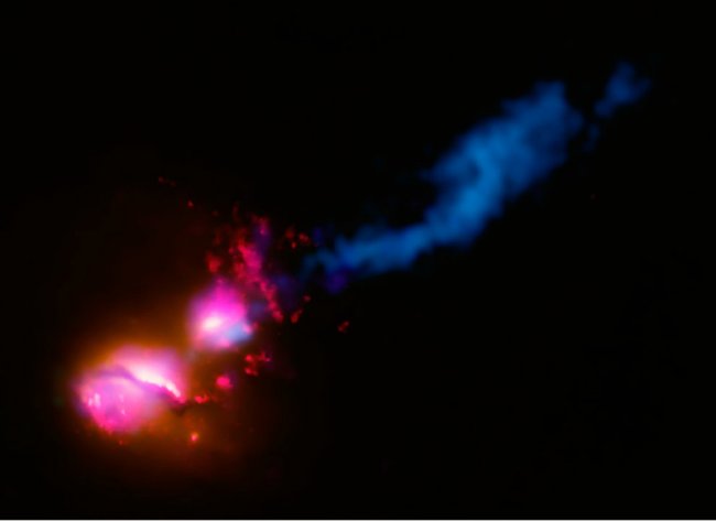 13. Мощный поток частиц из сверхмассивной черной дыры, ударивший по расположенной рядом галактике. Астрономы наблюдали столкновения галактик и раньше, но такой «космический выстрел» зафиксирован впервые. «Инцидент» произошел в звездной системе, расположенной на расстоянии 1,4 млрд. световых лет от Земли, где в настоящее время идет процесс слияния двух галактик. «Черная дыра» большей из двух галактик, которую астрономы сравнивают со «Звездой смерти» из киноэпопеи «Звездные войны», выбросила мощный поток заряженных частиц, который угодил прямо в галактику, находящуюся по соседству. (Фото NASA):