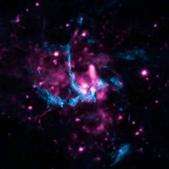 9. Астрономы долгое время искали подтверждение того, что Стрелец А — наша сверхмассивная черная дыра в центре Млечного пути, является источником струи плазмы. Наконец, они нашли его, — об этом говорят новые результаты, полученные рентгеновской обсерваторией Chandra (Чандра) и радиотелескопом VLA. Эта струя или джет образуется за счет поглощения вещества сверхмассивной черной дырой и ее существование давно предсказывалось теоретиками. (Фото NASA):