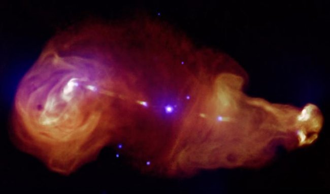 23. Плазма, выбрасываемая сверхмассивными черными дырами в центрах галактик может переносить огромное количество энергии на гигантские расстояния. Область 3C353 в свете рентгеновских лучей телескопов Чандра и Very Large Array окружена плазмой, выброшенной одной из черных дыр. На фоне гигантских «перьев» излучения галактики выглядят крошечными точками в центре. (Фото NASA):