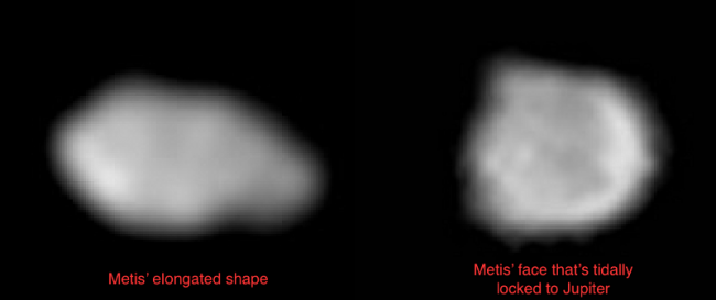Но ближайшим спутником Юпитера не является Ио: это Метис, по мифологии первая жена Зевса. Ближе Ио есть четыре небольших спутника, из которых Метис ближе всего — всего в 0,8 радиуса Юпитера от атмосферы планеты. В случае с Юпитером за нарушение орбит отвечают не атмосферные силы и не солнечный ветер; с орбитальной полуосью в 128 000 километров, Метис испытывает внушительные приливные силы, которые несут ответственность за нисхождение по спирали этой луны к Юпитеру.