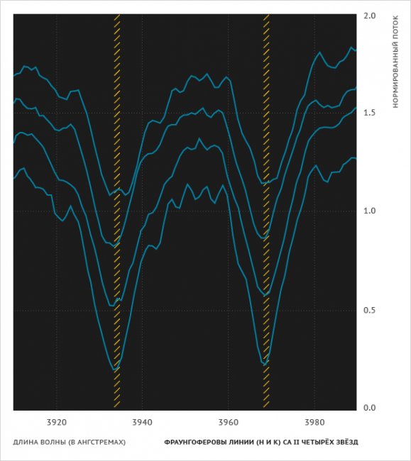 Солнечные вспышки классифицируются по пику интенсивности рентгеновского излучения (S-индексу). Минимуму соответствует пик A, равный мощности излучения, меньшей десяти в минус седьмой степени ватт на квадратный метр. Максимуму — пик X, в тысячу раз больше A. Ученые представили графики S-индекса (на примере линий поглощения кальция) звезд KIC 8493735, KIC 9025370, KIC 8552540 и KIC 8396230, равного в момент супервспышки 0,15, 0,23, 0,30 и 0,34 соответственно.