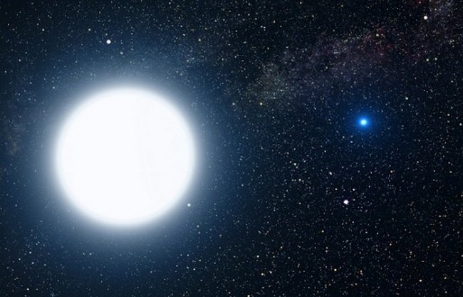 Сириус А гигантский, а яркая звезда Сириус В (справа) гораздо меньше по размеру. Очевидно, что Солнце является самым ярким на дневном небе, поскольку оно гораздо ближе к Земле, чем любая другая звезда. На ночном же небе самой яркой звездой является Сириус. Второй по яркости — Канопус.