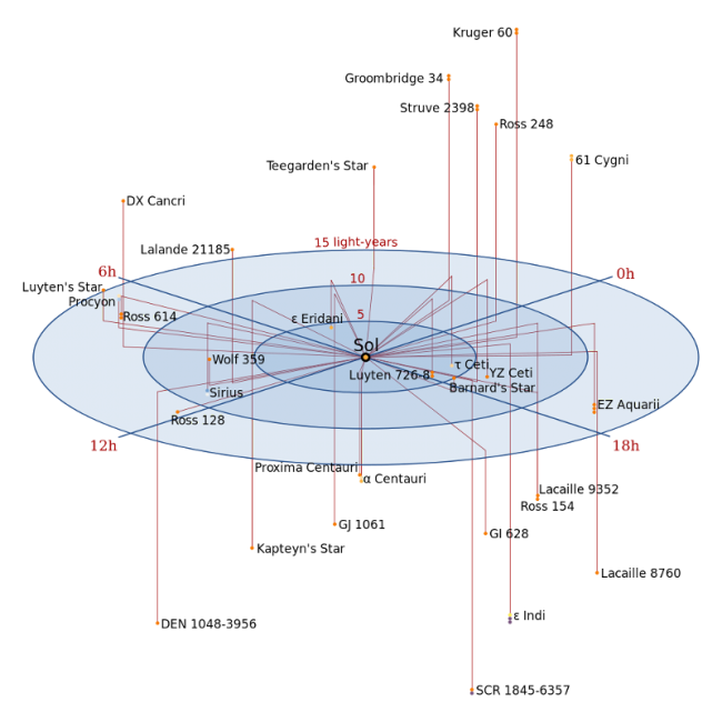 - 1 миллиард сеансов связи: 14 световых лет, в пределах ближайших 35 звезд и коричневых карликов; это число меняется по мере движения звезд через галактику