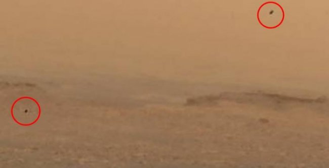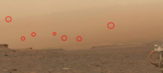 Однако даже пылевой бурей не объяснить, почему на этой панораме в воздухе висят множество темных объектов.