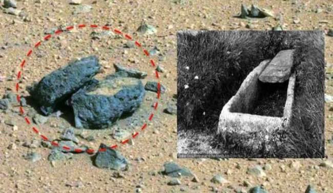 Но если мысленно положить ее на нижний камень, то она вполне подходит ему по размерам, словно так и было сделано. Подобные камни с нишами на снимках Марса ранее вроде бы не встречались, так что если это и не гроб, а природный объект, то все равно любопытное явление.