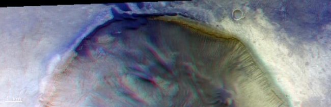 Увы, Дэвид Боуи был неправ насчет пауков на Марсе, хотя, глядя на эти восхитительные новые снимки огромного синего тарантула на поверхности Красной планеты, можно было бы подумать иначе. Эта картина в ложных цветах демонстрирует серию следов марсианских пылевых дьяволов. Фотографию, среди многих других, сделал европейский ExoMars Trace Gas Orbiter. Часть снимков выпустили сегодня, чтобы вы могли насладиться великолепными марсианскими пейзажами с высоты спутничьего полета.