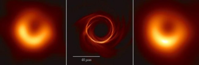Слева направо: настоящее изображение черной дыры галактики M87, полученное телескопом Event Horizons 6 апреля 2017 года; компьютерная модель черной дыры; компьютерная модель с подогнанным под телескоп Event Horizon разрешением