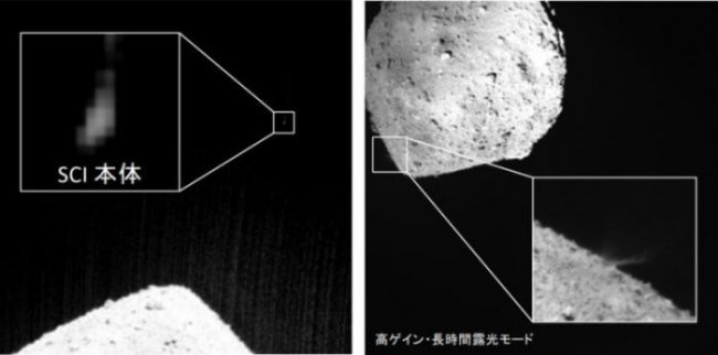 Сперва зонд спустил на поверхность астероида несколько прыгоходов – компактных роботов, изучивших его поверхность. Затем аппарат максимально сблизился с Рюгу, выстрелил в него танталовой пулей и собрал поднявшиеся в космос частицы его грунта. Однако самая «экстремальная» часть миссии зонда заключалась в сбросе настоящей бомбы на космический объект. Эту операцию аппарат как раз и провел 5 апреля этого года.