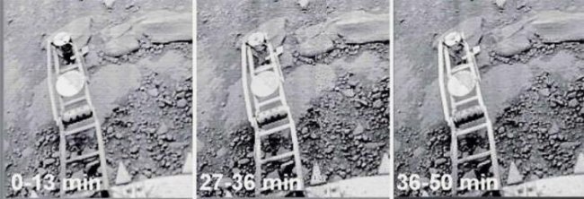 На этих фото видно, что в первые 13 минут после посадки на измерительном молотке появился чёрный объект. Он как будто обвил молоток. Последующие изображения (полученные в интервале от 27-й до 50-й минуты после посадки) показывают чистую поверхность молотка, «чёрный лоскут» отсутствует.