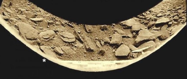 Там где на снимке стоит звёздочка, можно обнаружить «брызги крови». От посадочного буфера тянется тёмный след, который, по-видимому, оставлял за собой раненный аппаратом организм. След образован какой-то жидкой субстанцией неизвестной природы. До шестой минуты сканирования, когда объект возник на изображении, он сумел отползти примерно на 35 см.