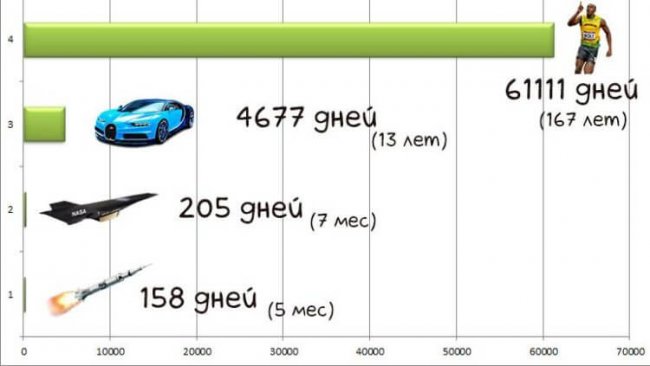 Для сравнения возьмём самую быструю на данный момент ракету ПРС-1М со скоростью 14,5 тысяч км/ч (она, конечно, не пассажирская, но давайте побудем Мюнхаузенами на ядре и возьмём для сравнения её. Всё-таки это самая быстрая ракета планеты), гиперзвуковой самолет Х-43А (11,2 тыс. км/ч), гиперкар Bugatti Chiron (490 км/ч) и самого быстрого человека на планете — Усейна Болта (37,5 км/ч).